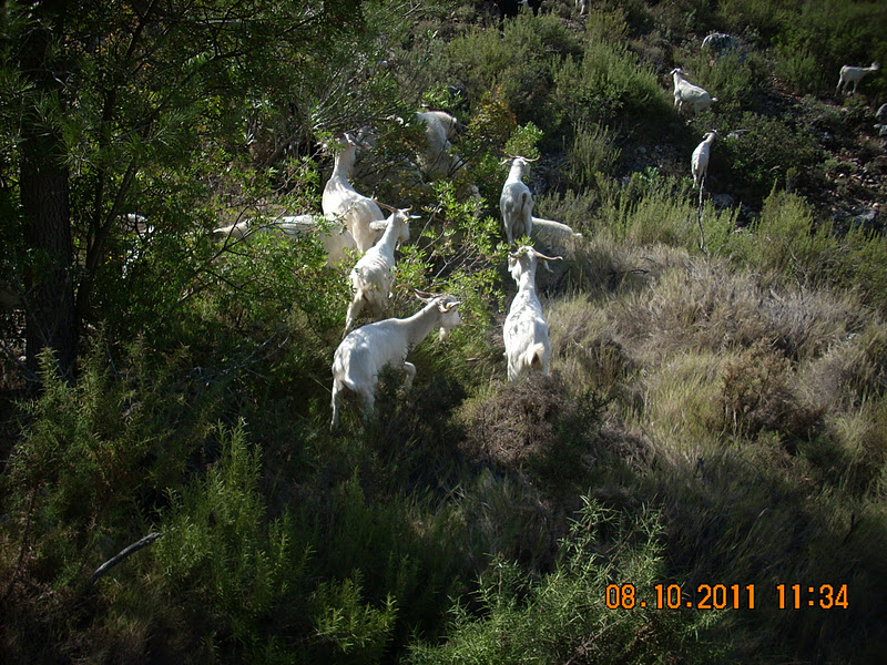 Tras el almuerzo, con Gabriel y Francisco, iniciamos camino y en el descenso nos cruzamos con un rebaño de cabras, ¡qué pensarían de nosotros! fotos a las cabras y hacía el barranc dels bassiets (Lorxa), próximo avituallamiento líquido, Gabriel empieza a quejarse de dolores en sus rodillas, le ofrezco ibuprofeno.